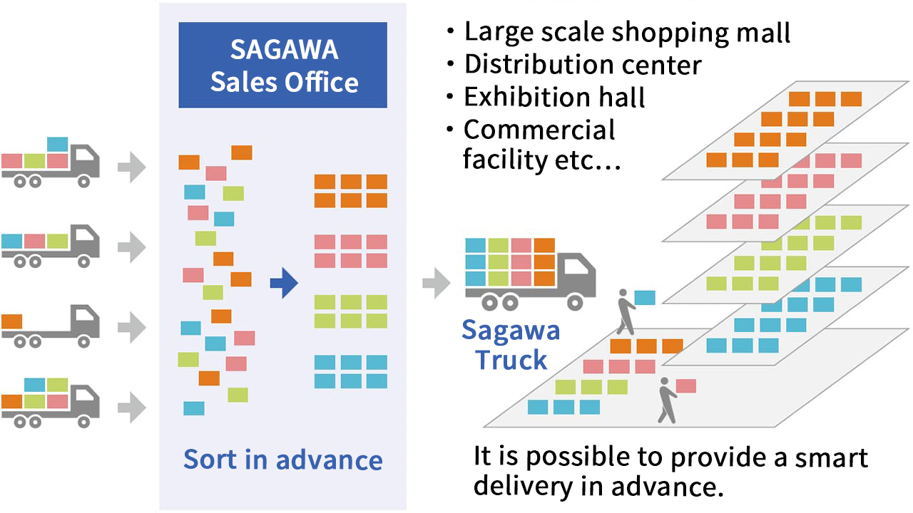 Smart Delivery is the industry's first custom-made delivery service that greatly improves work efficiency for customers after package delivery. We use time slot-specific delivery, including late night and early morning. Instead of delivering packages as they arrive, sorting codes are used to organize customer packages by product category, location, or other criteria, and then they are delivered in bundles. When combined with a delivery information service, Smart Delivery enables customers to not only to check the number of their packages in advance, but also request consolidated package delivery online. It is an environmentally friendly service that eliminates the need to sign for each package delivered and provides paperless delivery invoices.