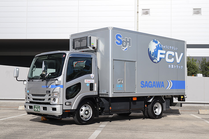 Sagawa Express is participating in the construction and social implementation of an energy management system to promote electric vehicles in Fukushima Prefecture and Tokyo*. As part of this effort, we have been sequentially introducing FCV (fuel cell vehicle) trucks and EV (electric vehicle) trucks since November 15, 2023. Since these vehicles do not emit CO2 or other exhaust gases while driving, we estimate that each vehicle can curb CO2emissions by approximately 12 tons per year.