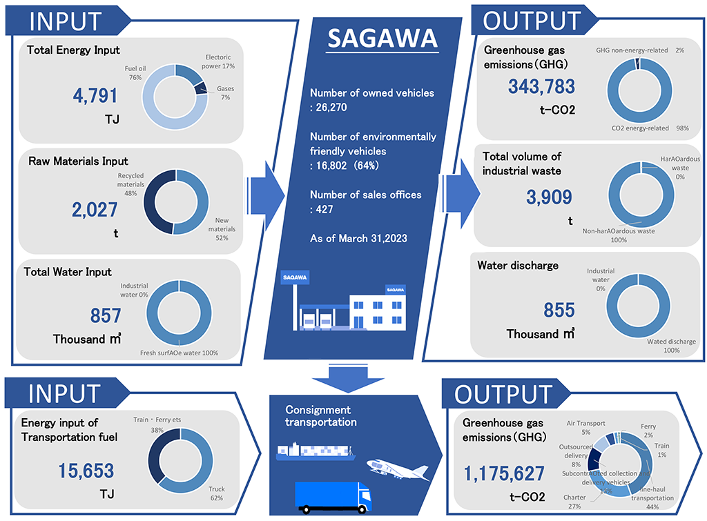 The following indicates the FY2022 results of resources Sagawa Express invested into its business activities (input) and burdens on the environment created by its emission (output).