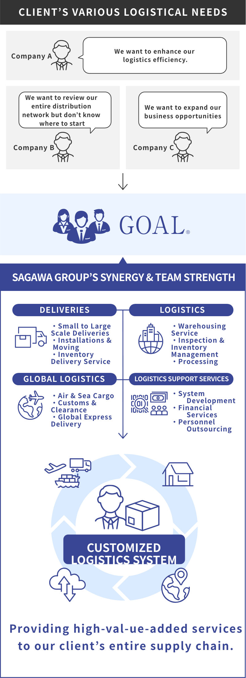 To fulfill your physical distribution needs, we at Sagawa operate various businesses, from delivery and logistics to overseas/international businesses, real estate, and IT system businesses. We create one-stop, custom-made physical distribution solutions for the entire supply chain to suggest you the optimal solution for your business.