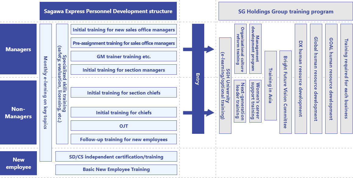We also have training programs to help employees acquire the skills and expertise required for their rank, as well as to help them further develop their careers. Further, in addition to training programs hosted by Sagawa Express, employees can also participate in training programs put on by the SG Holdings Group.