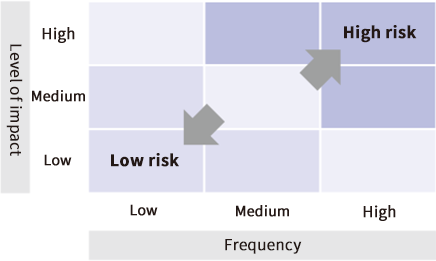 In times of normality, we use the following process to manage risks at each Group company. We first determine the risks and use a so-called risk map to analyze the level of impact and frequency of each risk. Based on the results, we list the risks in order of priority and take measures as necessary.