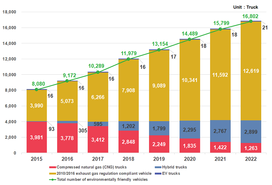 Compared to conventional gasoline and diesel vehicles, environmentally friendly vehicles have a smaller impact on the global environment. They emit lower levels of greenhouse gases such as carbon dioxide which promote global warming, as well as air pollutants contained in exhaust gas (nitrogen oxides and particulate matter, etc.). As of the end of fiscal 2022, Sagawa Express owns 16,802 environmentally friendly vehicles, and environmentally friendly vehicle share of its fleet is increasing year by year.