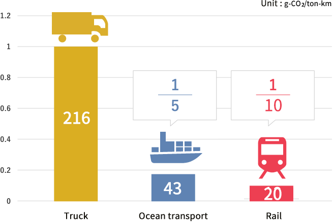 Compared to truck transport, the amount of CO2 emitted to transport a ton of cargo for one kilometer is about 1/10th for rail and 1/5th for ocean transport.