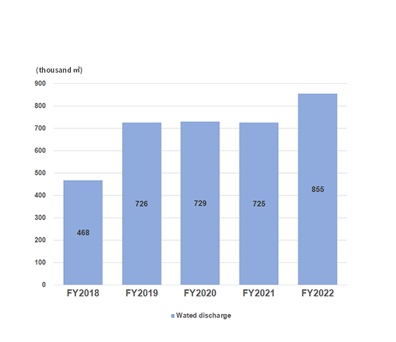 - In FY2018, the calculation only included sites for which wastewater discharges could be monitored, but beginning in FY2019, sites for which wastewater discharges could not be monitored were also included in the calculation, with the water inputs considered as wastewater discharges.