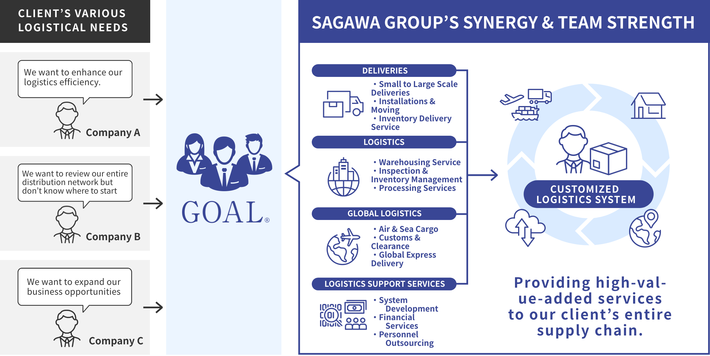 To fulfill your physical distribution needs, we at Sagawa operate various businesses, from delivery and logistics to overseas/international businesses, real estate, and IT system businesses. We create one-stop, custom-made physical distribution solutions for the entire supply chain to suggest you the optimal solution for your business.