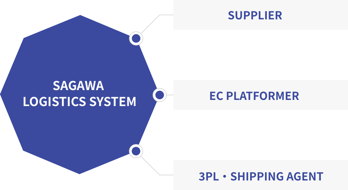 GOAL aims to offer integrated logistics solutions to client companies by combining the functions of each of our group companies, including the nationwide network of Sagawa Express that excels in B2B logistics, the know-how we have acquired from SGL's distribution processing and warehouse operation, international forwarding, IT systems, and payments.