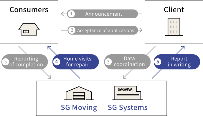 An unexpected situation came up, and Company A asked GOAL for advice, not knowing what to do and how to do it. GOAL predicted a possible flow of operations based on how the team had handled similar cases. Then, GOAL proposed home visits for product repair and on-site replacement of defective parts. Moreover, the costs were minimized by the use of the Sagawa Express Group’s integrated logistics.