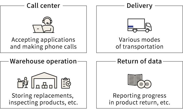 We help you with mandatory and voluntary product recalls. In the unlikely event that the products you have distributed in the market are defective, we will help you promptly collect them and manage the crisis. If products that need replacement or repair cannot be returned, our expert staff will visit where the products are to replace or repair them on site. When implementing this, we will promote prompt policymaking, preparations, and the steady recall of the products. We will handle everything, from issuing notices to receiving calls, collecting the products, and providing after-sales service.