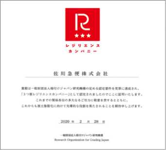 In the Resilience Grading system run by the Research Organization for Grading Japan, we were awarded the first Three-Star Resilience Company certification. This certification is awarded to companies and organizations who are proactively engaged in disaster preparedness and disaster reduction activities. In this case, we were recognized for our efforts to prepare for disasters such as the Great East Japan Earthquake and large-scale typhoons.